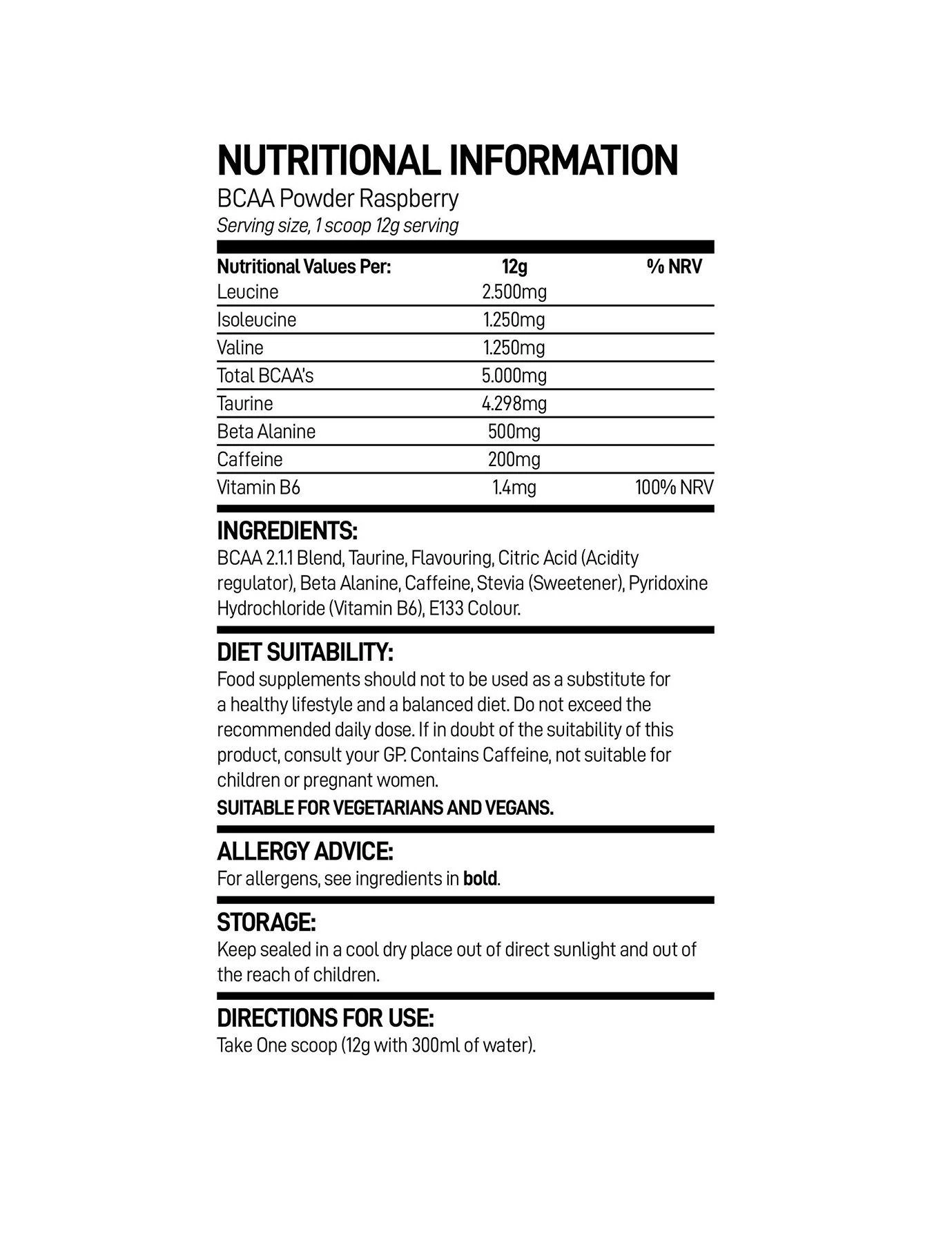 Branched Chain Amino Acids (BCAA’s) contain a 2:1:1 ratio of Leucine, Isoleucine and Valine. These amino acids are considered to be essential amino acids as they cannot be synthesised in the body. BCAA’s can be consumed throughout the day for or before, during and after workouts. You can increase the effectiveness of BCAA’s by consuming with Vitamin B6, which is why each serving contains 100% of your RDA.