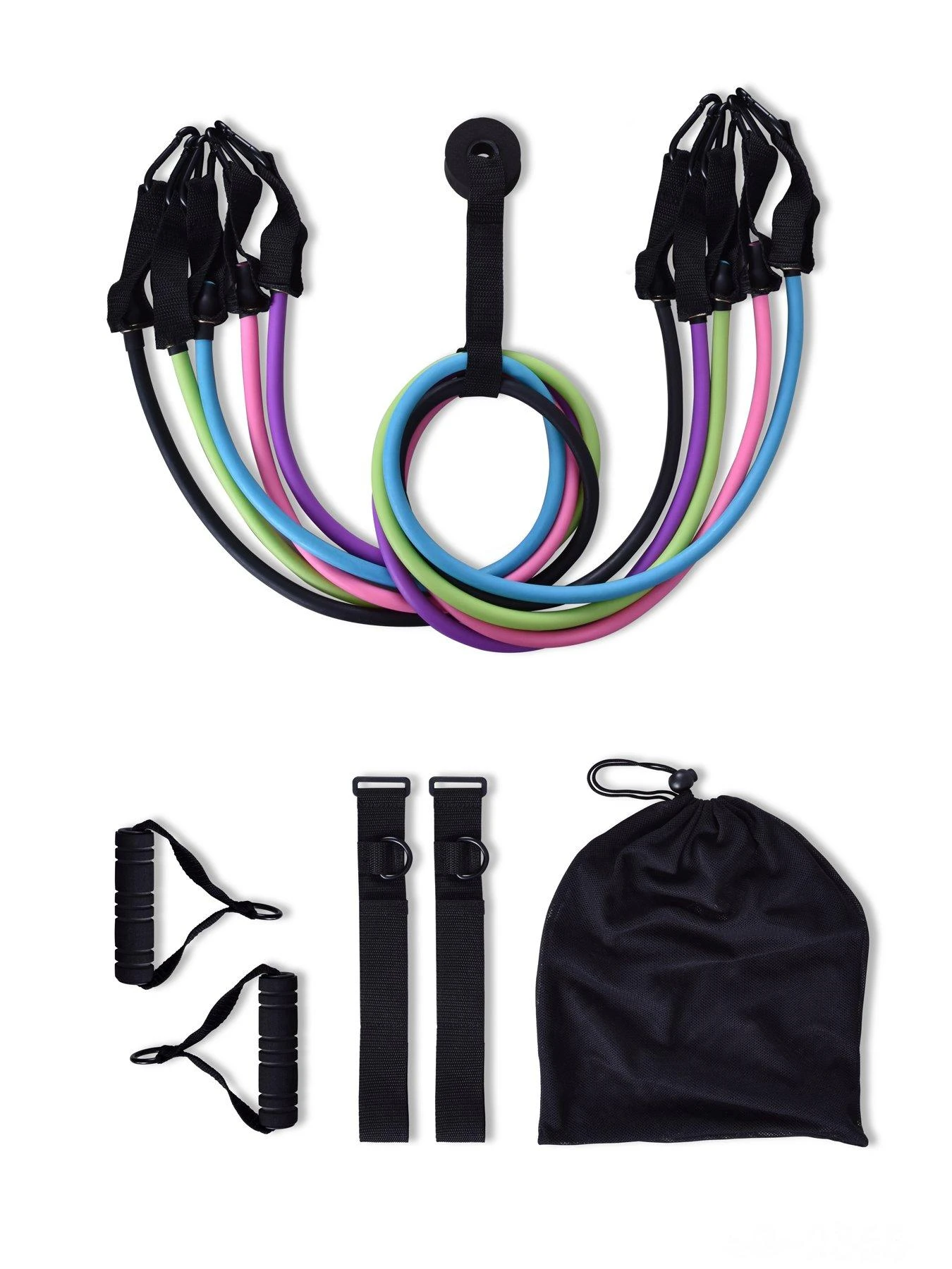 - The kit consists of: 5 adjustable tubes 1 x door anchor 2 x ankle wraps 2 x handles 1 x carry bag