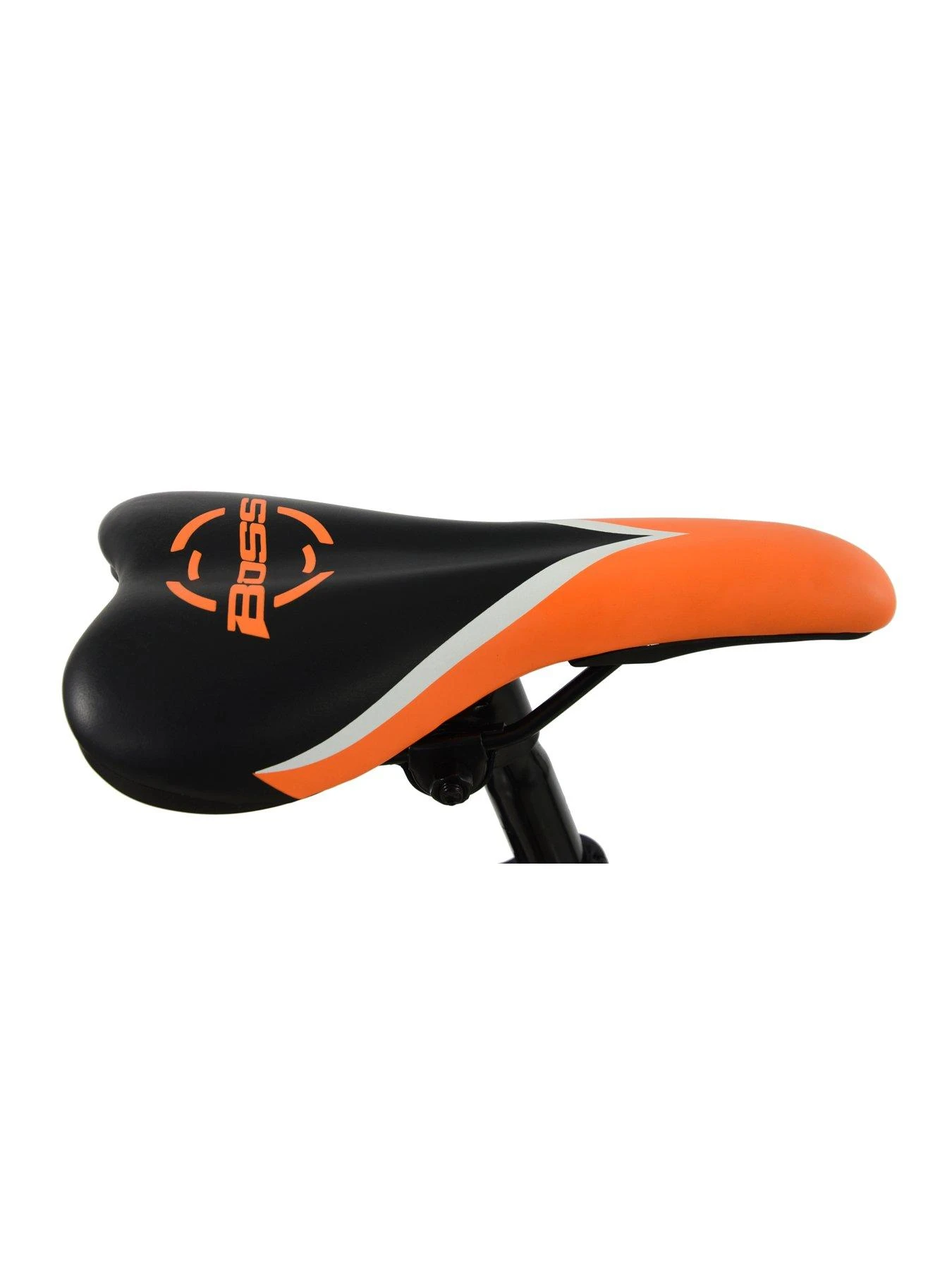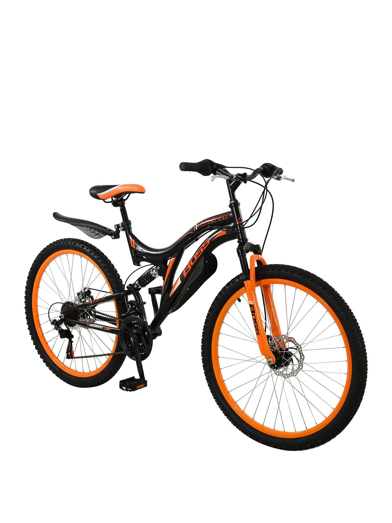 The Boss Black Ice 26 inch full suspension mountain bike features a stunning new curved top tube to really make it stand out from the crow. The Black Ice has a strong hi-tensile steel frame with a 750 lb rear shock absorber and Zoom front suspension fork to provide a responsive ride and take the bumps out of the terrain. Control is further enhanced courtesy of the front and rear Zoom branded mechanical disc brakes. The 3-finger alloy brake levers respond well to the touch for re-assuring feedback, whilst 160 mm wavy rotors disperse heat to extend braking performance on long downhills. 18 speed Shimano gearing is controlled by Shimano Revo shift shifters, for a natural and seamless gear change. 2.1″ wide sure-grip knobbly mountain bike tyres keep you moving in the right direction and are supported by lightweight and robust, double wall painted alloy rims to provide a strong base for your ride. The rims are finished in striking Gloss orange. The satin black frame and components create a truly premium look. A Comfortable full colour MTB saddle is fitted along with a decent length seatpost for the best possible fit. To complete the line-up, a sleek frame mounted front mud-guard and extended rear mudguard catches the crud thrown up whilst out on your ride and adds a cool aggressive edge to the design. If you are looking for an eye-catching bike with the spec to impress, then the Boss Black Ice is the bike for you. Suitable for inside leg measurement of 71cm – 81cm / 28-32″