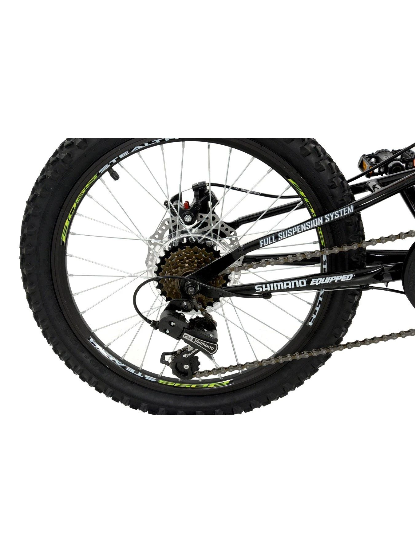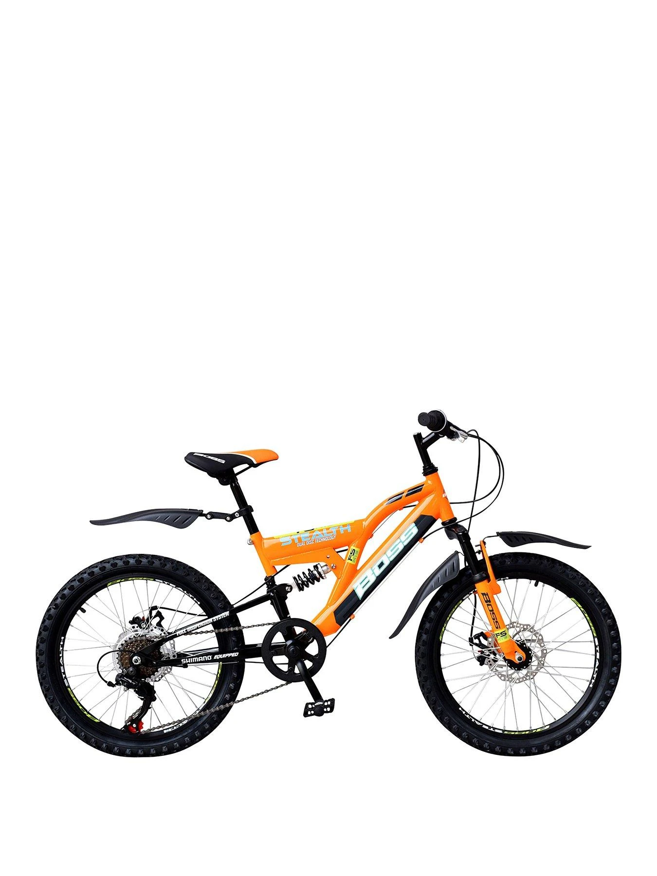 The Boss Stealth has been the best-selling model in our adults range for many years now, but why should it just be adults who have all the fun? We’ve reworked the specification to suit our all new junior full-suspension frame and we think the result is pretty awesome! Not only do you get suspension on the front and rear, but also powerful mechanical disc brakes. Couple with that the reliable 6 speed gears and super strong double-wall alloy rims and you’ve got a bike that is made to take the rough and tumble that any typical 6-9yr old will throw at it! Suitable for children with an inside leg measurement of approx. 53-60 cm/21-25?