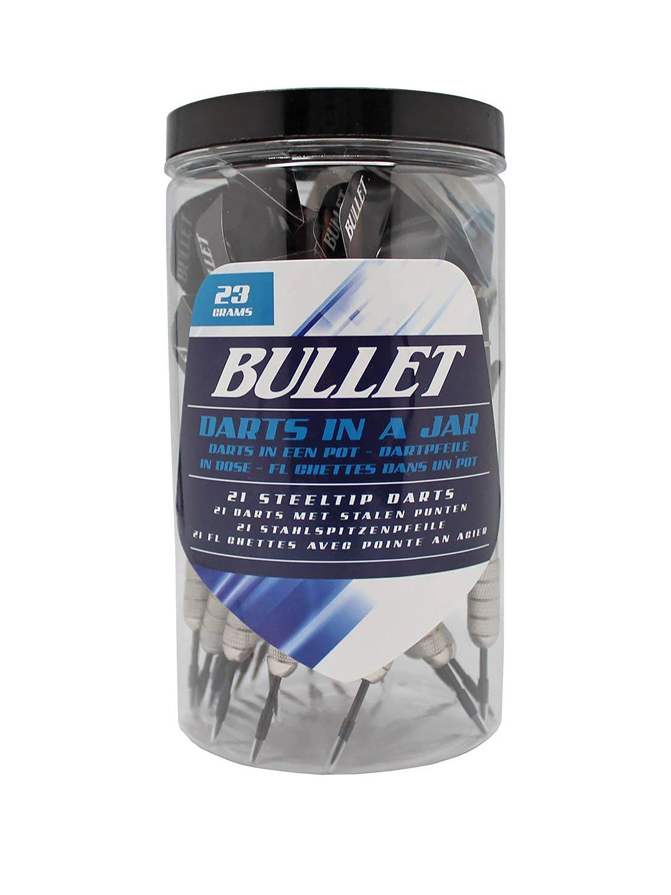 The Bullet Darts In a Jar Set includes 21 steel tip darts for competitive play.