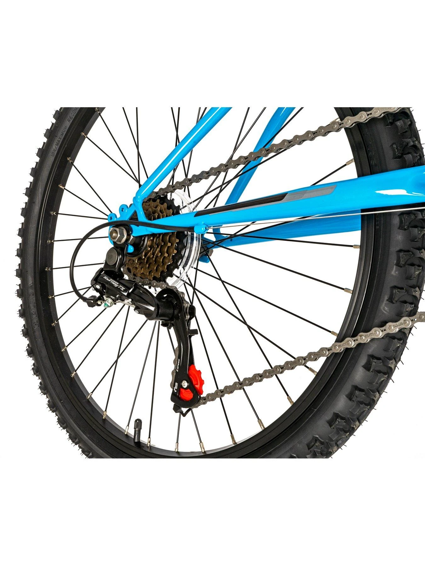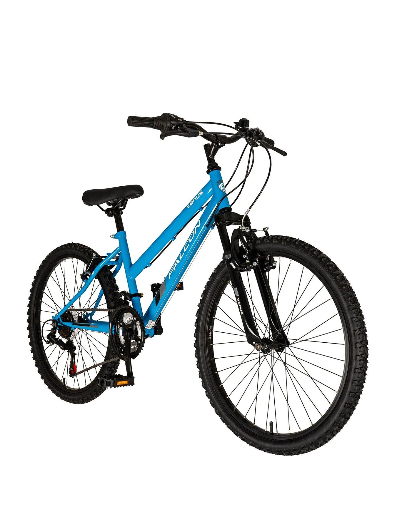 The Falcon Venus 24″ bike has been designed specifically for junior riders aged 9-12 years with a lightweight frame and performance suspension fork capable of riding over trails. The hi-tensile steel frame is strong and durable while the suspension fork provides extra comfort when the riding gets rough with a soft spring suitable for junior riders. As well as being great looking, the Venus has a great spec to match. The 6-speed rear gearing is powered by a Shimano rear derailleur and Revoshift shifter, while the front 3 chainrings give a wide range of gears, perfect for tackling steep hills and fast descents. The chainwheel guard protects fingers and clothes and prevents the chain from slipping off the chainring. MTB style pedals provide reassuring grip and the soft compound handlebar grips are durable and comfortable to hold. Braking is taken care of by reliable front and rear V-brakes with specially designed reach-adjustable brake levers that can be adjusted to accommodate smaller hands. The Venus is ideally suited to grow with young riders thanks to the longer 250mm seat post, adjustable saddle fore and aft position and quill handlebar stem that can be adjusted up and down to suit. The wheels are assembled with strong yet lightweight alloy rims and knobbly MTB tyres for extra grip when riding off road. The Falcon Venus really is a cut above the rest and the perfect bike for young riders looking to progress their offroad riding skills before they are big enough for an adult bike. Suitable for kids ages 9-12 years. Inside leg measurements 56-67 cm/22-26?.