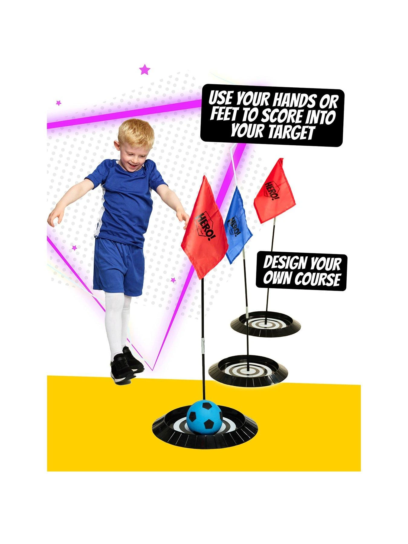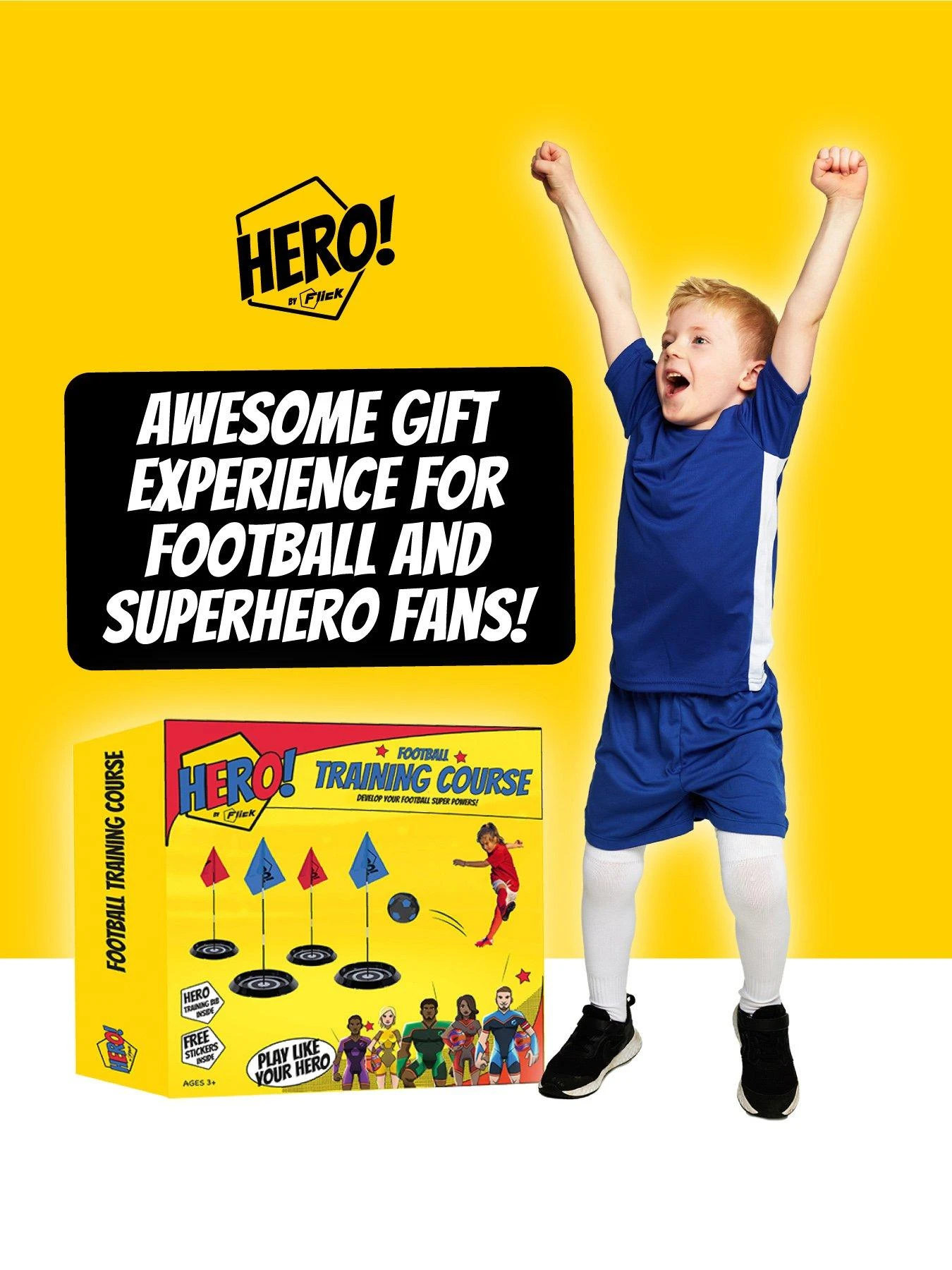 Start your football journey and play like your hero with the new Hero! range by Football Flick. The Football Flick Hero! range is all about fun and imagination. It has been specifically designed for junior players aged 3-7 to express themselves through play. The range is an introduction to the world of football, providing hours of fun and entertainment. The Hero! Target Course has been specifically designed to help young players have fun whilst improving shooting and accuracy. It’s not all about football though, use your hands to roll the ball into the targets and improve hand eye co-ordination. The target course comes with four poles, flags, and target zones to aim for. It also includes 2 miniature footballs, a pump and specially designed Hero! bib. The lightweight materials mean the Hero! target course is perfect for playing indoors or take the course into your back garden and enjoy hours of fun out there. The poles and flags are easily collapsible, allowing for east storage. Even better than that, the pack also includes a range of other fun superhero activities including stickers and colouring in sheet that’s sure to entertain for hours. There’s even a score card so you can track and share achievements with friends and family. Don’t forget, every Hero! product includes a FREE downloadable football flick mobile game so you can take your game anywhere!