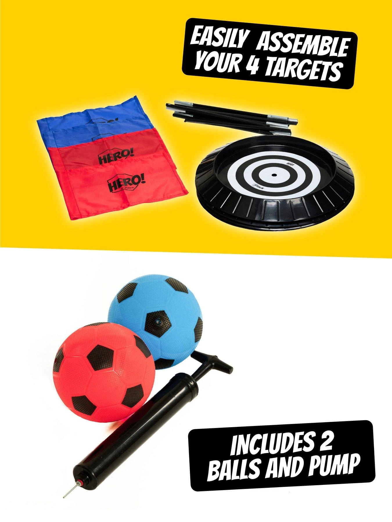 - Target course includes 4 poles, flags, target zones to aim for, 2 miniature footballs and a pump