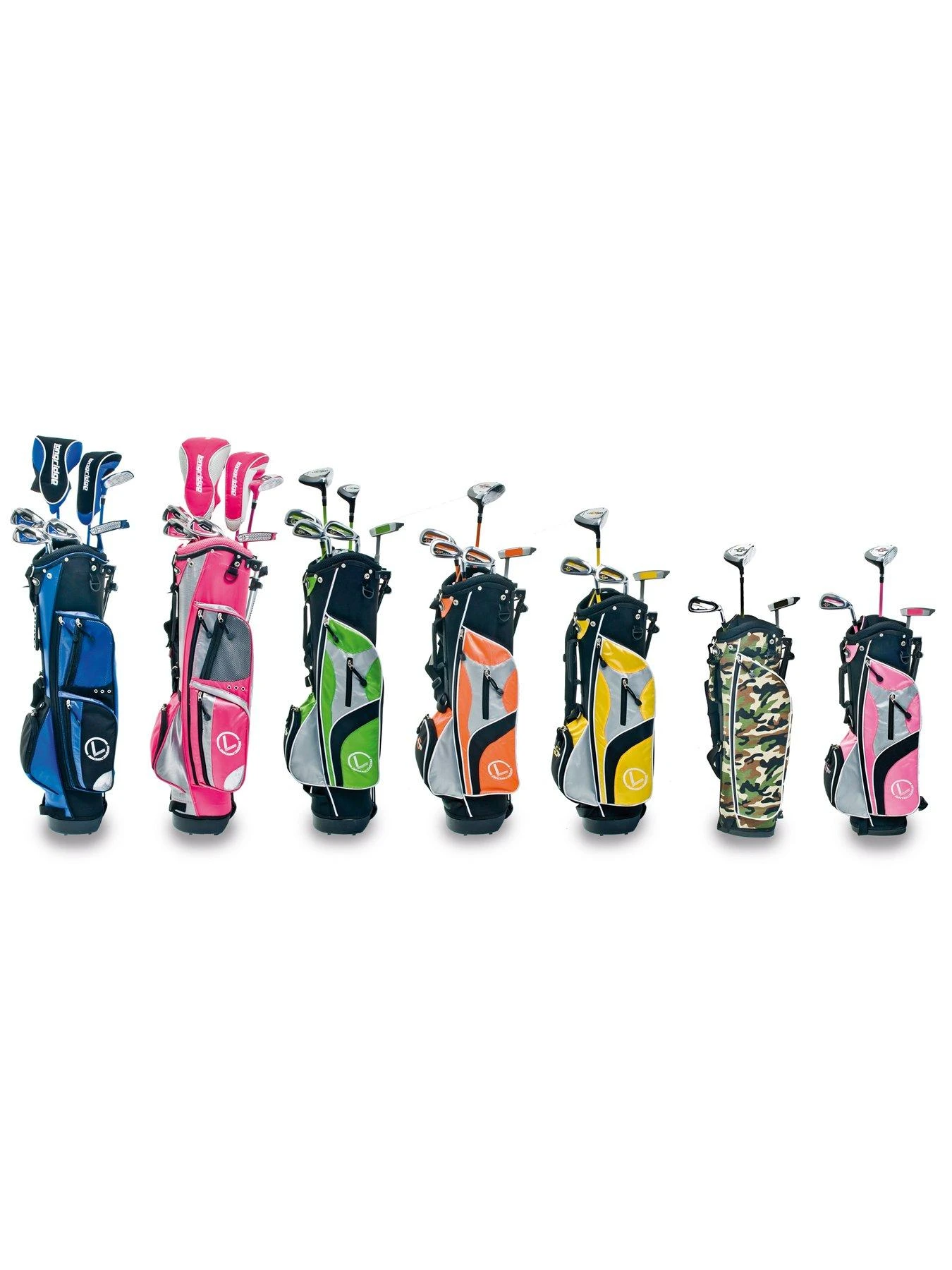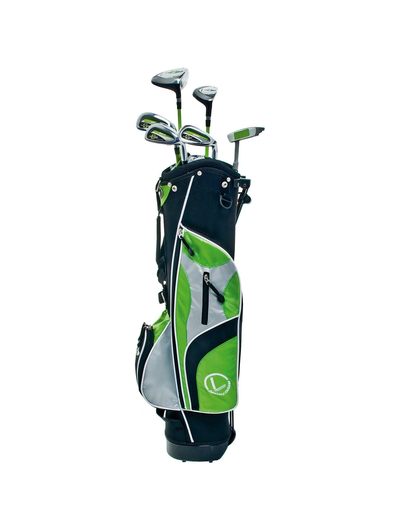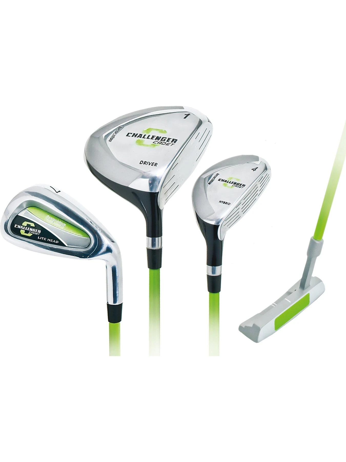The Junior Challenger set from Longridge is specifically designed for junior golfers in mind. Bright colours combined with advanced technology make this set attractive and fun, as well as being easy to use. Junior challenger six piece starter set including Driver, Hybrid, 7,9 and PW irons, putter and stand bag. All packaged in a colour box. The clubs are all fitted with graphite shafts that are both bright and appealing. A fun set for children aged 12 +. A light weight club head and shaft aid the typical swing speed of a junior golfer. The bag is green in colour as well to match the set and comes fitted with a dual padded strap as well as several storage pockets.