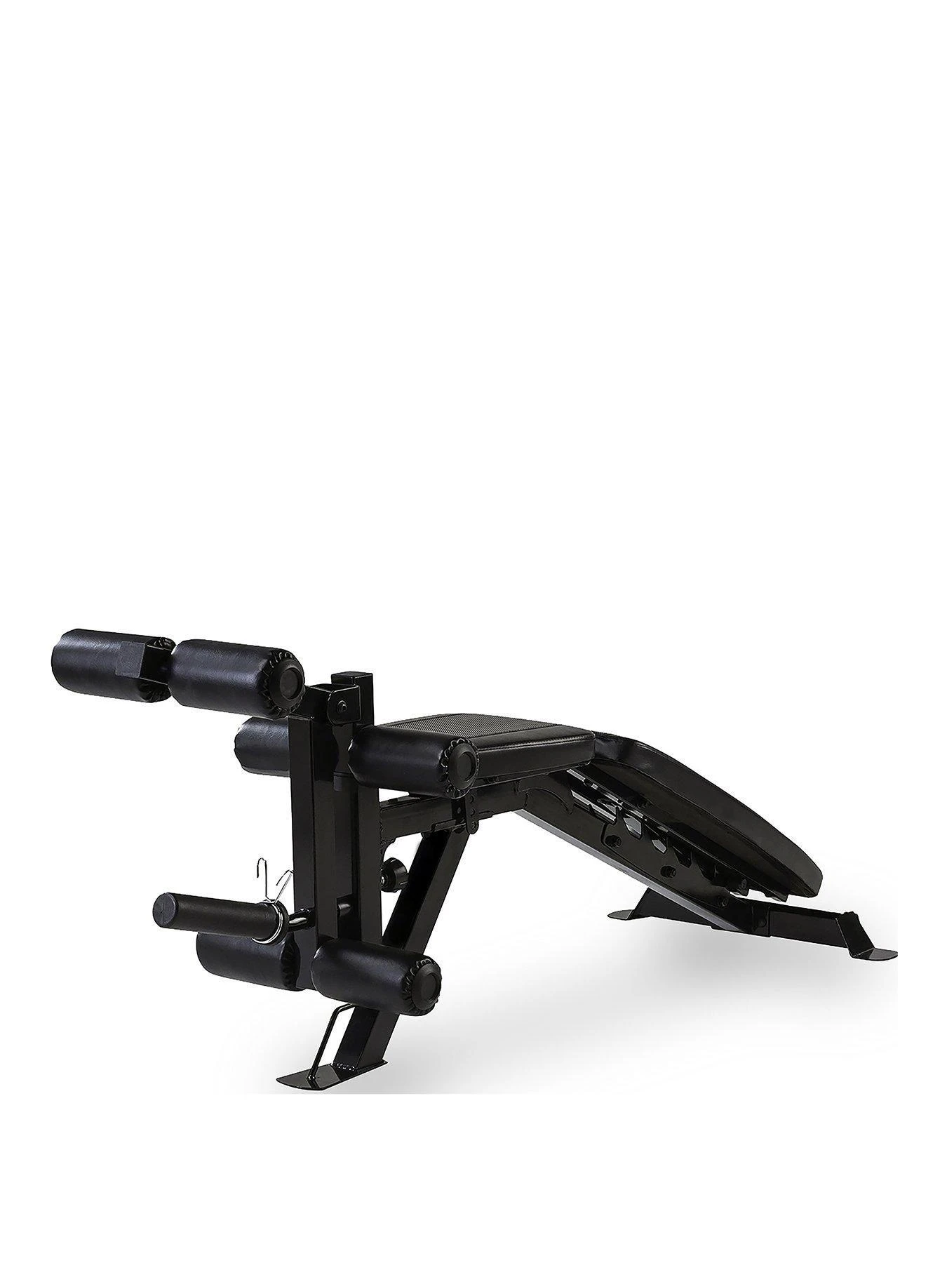 - Adjustment ranges through decline, flat, incline and upright positions.