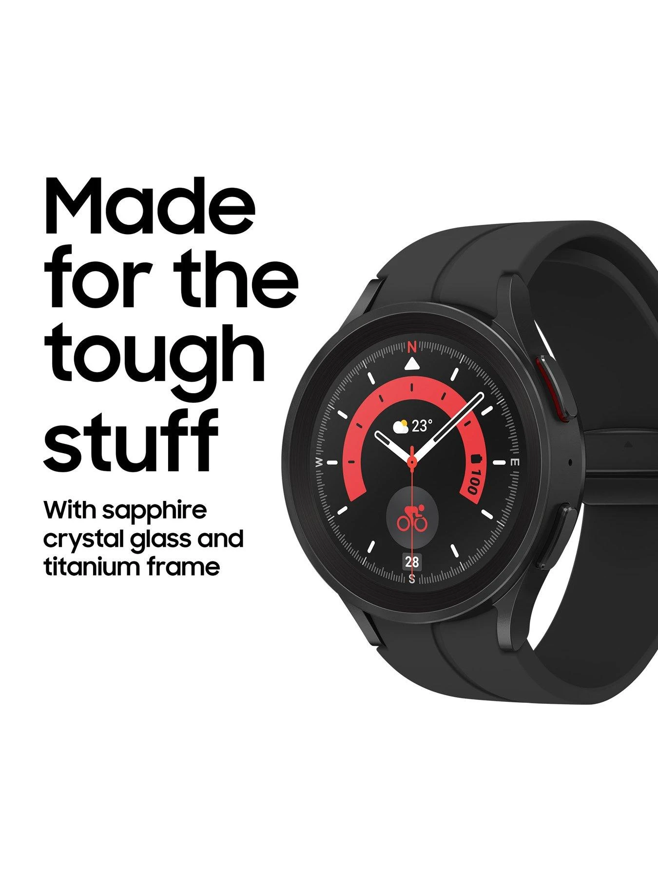 - Galaxy Watch5 Pro is built for adventure, with sapphire crystal glass, a tough titanium frame and a magnetic D-buckle strap.