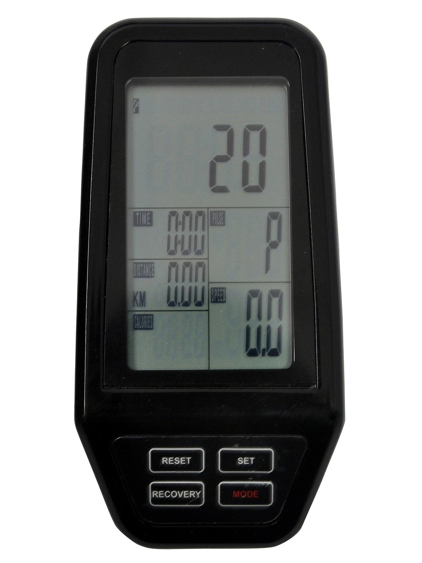 - 7-function LCD exercise monitor displays theoretical calorie burn, distance, pulse (via hand pulse pads), RPM, scan, speed and time functions