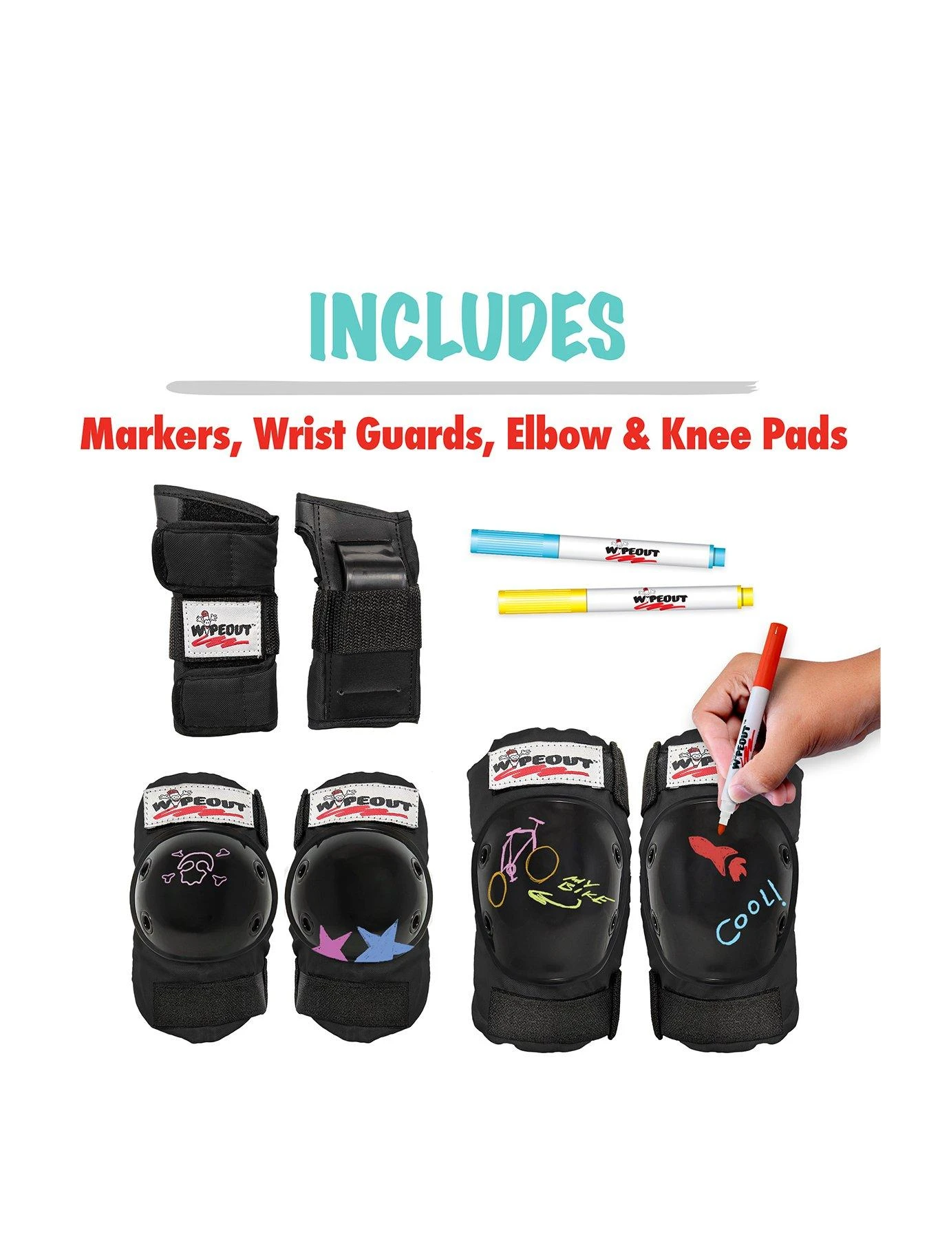 Includes Multi-Sport Wristguards, Knee Pads & Elbow Pads, as well as 23 dry erase non-toxic markers for youngsters to add their own designs. They can also wipe clean and start again over and over! Designed for use across a multitude of roller sports, including Bikes, Skateboards, Scooters, Roller skates and Inline skates (roller blades).